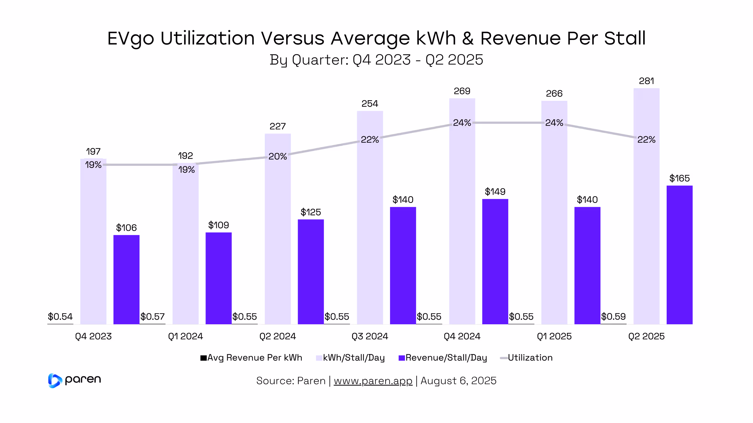 However, despite a drop in utilization rate, EVgo saw its kWh Per Stall/Per Day (throughput) increase to 281 from 266 in Q1. Secondly, Average Revenue Per Stall/Per Day rose to $165 versus $140 in Q1. And thirdly, Average Revenue Per kWh increased to $0.59 from $0.55 in Q1.