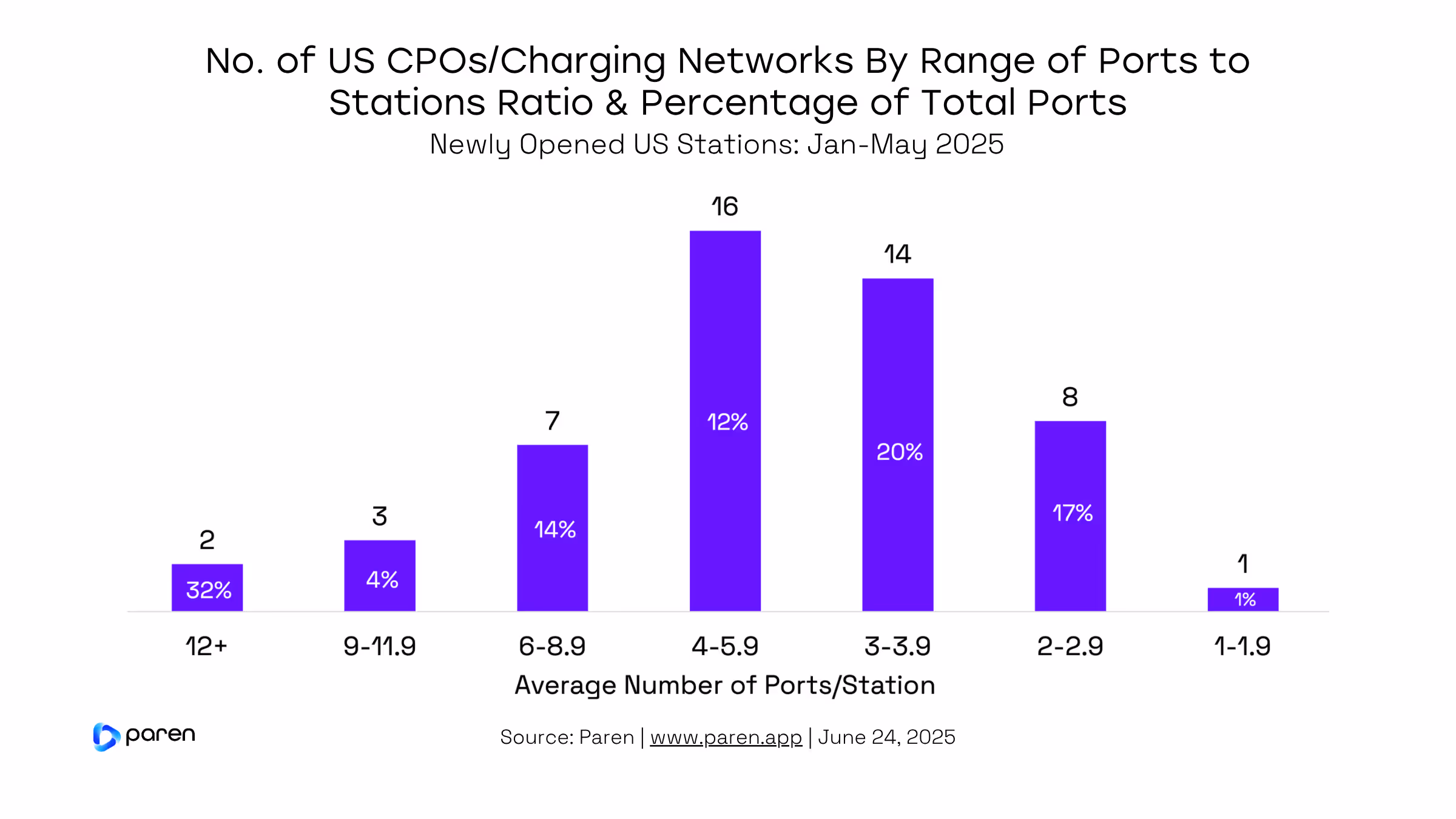 Of the 68 charging point operators (CPOs) and networks Paren tracks, 51 opened at least one new station during the first five months of 2025. Among those, 28 averaged four or more ports per station—and 12 exceeded six ports on average.